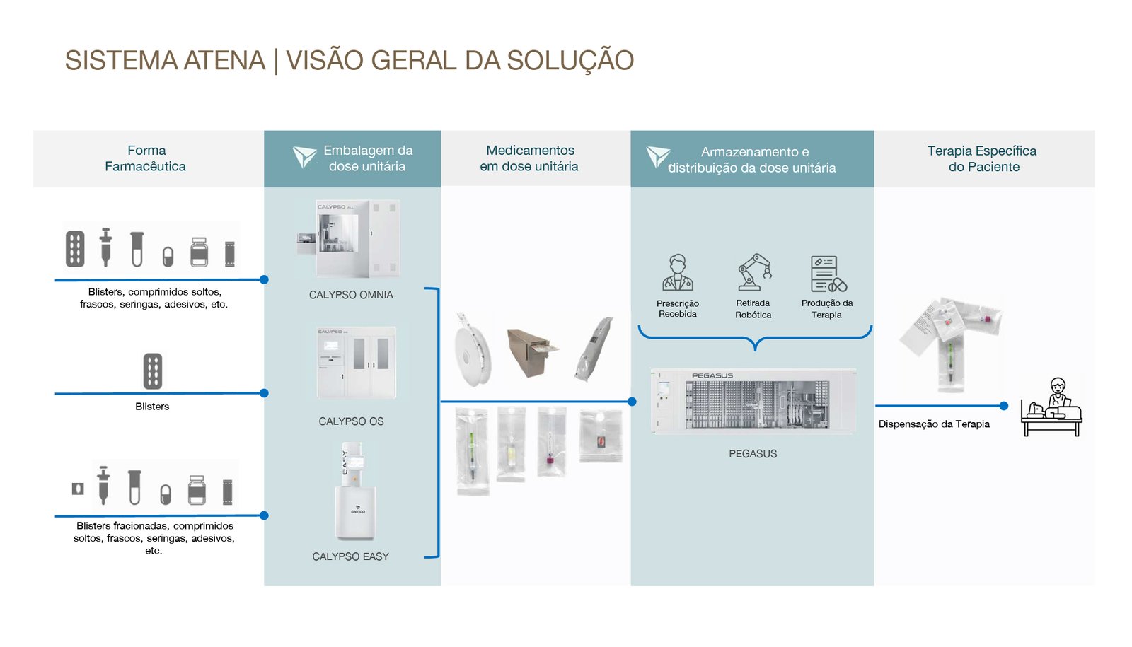 Plataforma totalmente automatizada para unitarização, embalagem e registro de doses, com alta integração, operação contínua e cobertura de amplas formas do portfólio hospitalar como blister, ampolas, saches, granel, frascos, etc.